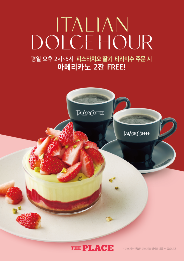 - Couple/Party 세트메뉴 할인 - 평일 14시 ~ 17시 피스타치오 딸기 티라미수 주문 시 아메리카노 2잔 제공 - 장소 : L3 The Place - 기간 : 2/5(목)~3/31(화)