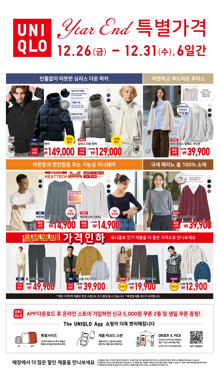 - 히트텍 이너웨어, 후리스 가디건 등 겨울 인기 아이템 특별가격 (프로모션 상품 및 사은품 내용 변동 가능) - 장소: L2 유니클로 - 기간: 12/26(금)~12/31(수)